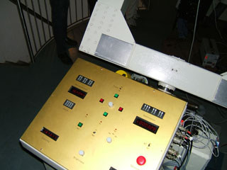 | Endlich das Teleskop! Unser Führer (der Herr mit dem langen Haar:) am Bedienungspult. Leider wurde das Teleskop gerade repariert. Zumindest lag Werkzeug und ein Einfülltrichter auf dem Tisch daneben. Mit diesem wird nicht, wie wir erst vermuteten, der Rotwein im Großgebinde den Mitarbeitern eingetrichtert, sondern damit wird flüssiger Stickstoff zur Kühlung bereitgestellt. Wie wir aus bester Quelle erfuhren, gilt im Teleskopwesen die gleiche Regel wie beim Saufen - gekühlt wirkts besser! | ![]() |